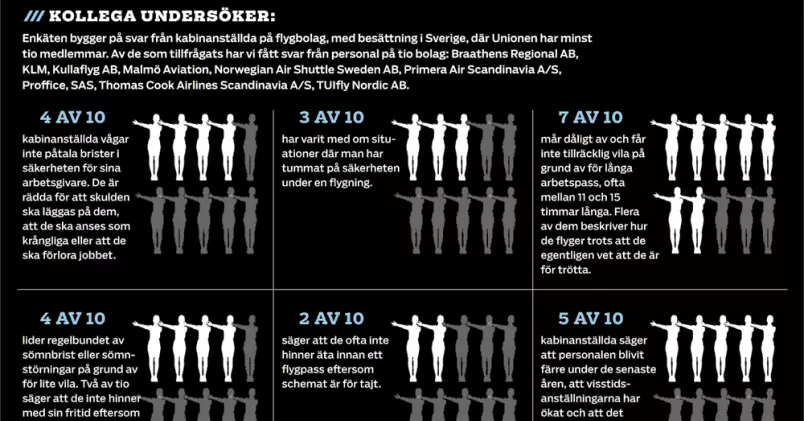 Hos de tio flygbolag som Kollega pratat med uppger fyra av tio i kabinpersonalen att de inte vågar påtala brister i säkerheten, av rädsla att upplevas som krånglig av arbetsgivaren och i slutändan bli av med jobbet. Tre av tio säger dessutom att man har tummat på rutiner när olyckan varit nära.