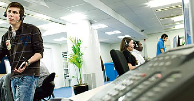 Telefonförsäljarna som arbetar med telemarketing delar arbetslokal med många andra, som arbetar med kundtjänst, ibland kombinerad med lite försäljning. Arbetsplatsen är dimensionerad för 220 produktionsenheter, som det heter. En blå heltäckningsmatta dämpar ljudnivån. Här och där står stora skärmar, som nödtorftigt skiljer de olika avdelningarna åt.