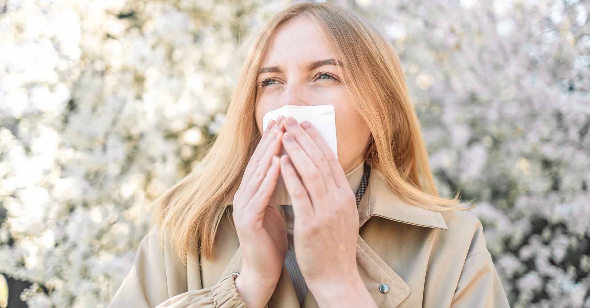 En kvinna snyter sig under ett blommande träd