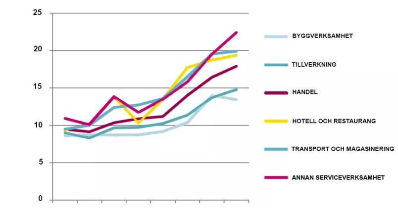 Sjukfallens utveckling 2008-2015 inom utvalda branscher (antal sjukfall större än 90 dagar per 1000 anställda). Källa: Unionen
