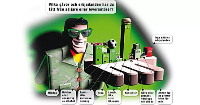 Det som anses acceptabelt att ta emot stämmer väl överens med svaren på frågan vad cheferna själva har erbjudit sina affärskontakter. De flesta har bjudit på lunch, men bara 30 procent på middag och bara 14 procent på alkohol. De som säger att de ger direkta gåvor, värda upp till 500 kronor, utgör 13 procent.