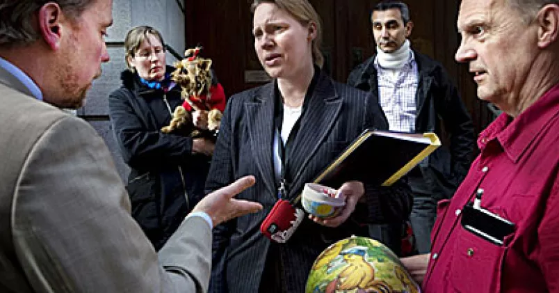 Ett femtontal oroade hade samlats utanför Socialdepartementet när namnunderskrifterna skulle lämnas över. Med sig hade de även påskägg med godis, detta går trots allt under namnet Påskuppropet, och kanske lite smågodis kan blidka socialförsäkringsministern...