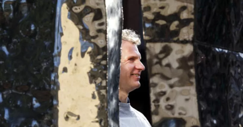 Boris Samuelsson arbetar på Synskadades Riksförbunds kansli i Enskede, söder om Stockholm. Vi har gått ut i den skarpa vårsolen för att fotografen har fått syn på ett konstverk som skulle passa bra som bakgrund. Boris skojar och säger att som blind kan man njuta av solskenet utan att behöva kisa.