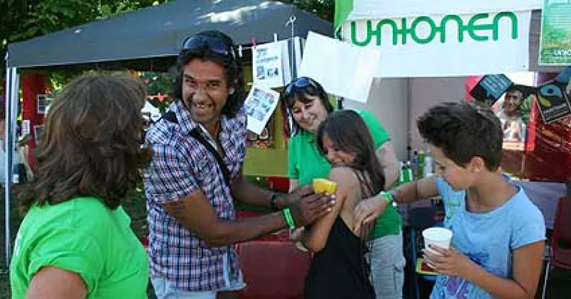 Unionen i Dalarna skyddar även sina presumtiva medlemmar. Fyllda vattenflaskor till skydd mot uttorkning, gröna äpplen och kolor mot blodsockerfall och hunger, plåster mot skavsår och blåsor, öronproppar mot hörselskador, kondomer mot läbbiga sjukdomar och oönskade graviditeter samt frågespel mot eventuell tristess gick åt som smör i det intensiva solskenet på festivalen.