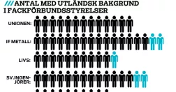 Närmare hälften av styrelseledamöterna för de fem mäktiga facken inom industrin har ett efternamn som slutar på –son. Av 66 ledamöter är endast fem födda i ett annat land. I Unionen, ingen. Trots att drygt 13 procent av dem som jobbar i industrin är födda utomlands. Det visar Kollegas granskning av förbundsstyrelserna.