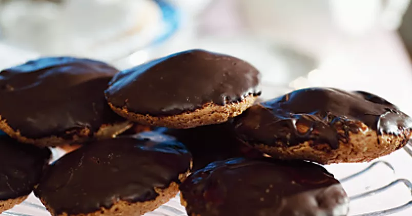 7. Smält chokladen och kokosfettet i vattenbad. Doppa krämsidan i choklad. Låt stelna.