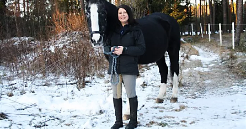 - Han är snäll och klok och tar det mesta med ro. När barnen var små sprang de runt hans ben och under hans mage utan att han protesterade. Häromdagen när vi red i skogen hade det kommit snö och en stor tall knäcktes och föll över grusvägen alldeles bakom oss. Han tog några galoppsprång men lugnade sig snart. En annan gång fastnade Lucky med hoven i en grenklyka. Jag trodde nog att han skulle få panik, men i stället stod han still så att jag kunde hoppa av och dra isär grenen.