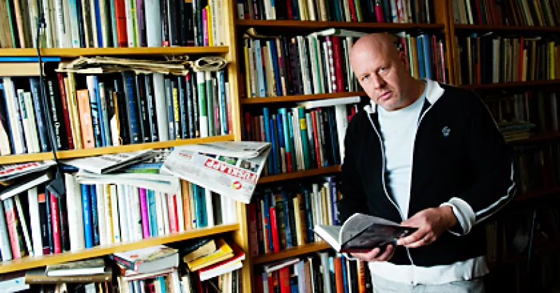 - Jag har så mycket böcker hemma att min fru blir alldeles galen. Vi har kanske femtio hyllmeter, mer går inte att spara. När jag var ung hade jag ett romantiskt förhållande till böcker, men nu är det som att få godis varje dag eller som att bada i champagne. Det blir inget mysigt till slut.