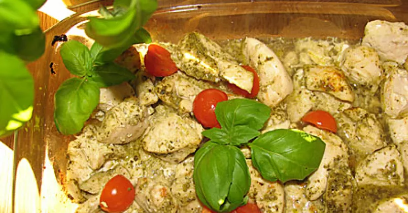 Blanda kycklingen med pesto och salta lätt. Lägg dem i ugnssäker form. Stek i ugnen 10 minuter. Rör och om och lägg i halverade tomater. Stek i ugnen 5-7 minuter.