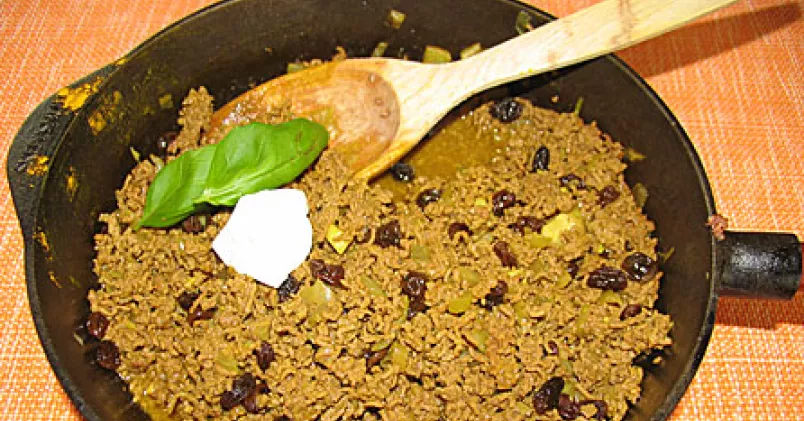Hacka lök och vitlök. Fräs i stekpanna med rapsolja. Tillsätt färsen och bryn allt en stund. Tillsätt kryddor, vatten och buljongtärning. Låt puttra 4-5 minuter. Lägg i russinen och låt puttra ett par minuter till. Servera med klyftpotatis och en klick gräddfil.
