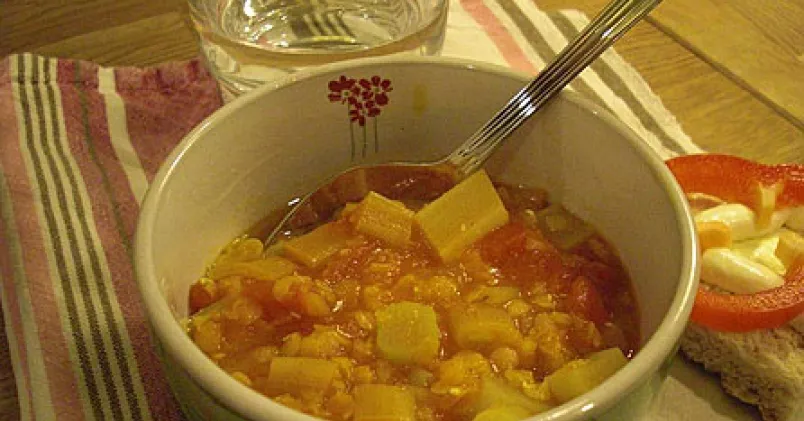 Strimla purjolöken. Fräs purjon med curry och olja. Skölj linserna väl och tillsätt dem. Häll på vatten, buljongtärning och krossade tomater. Koka i 10 minuter eller tills linserna är mjuka. Smaka av med salt och peppar och eventuellt om det behövs mer curry. Pressa i vitlöksklyftan. Servera med bröd.