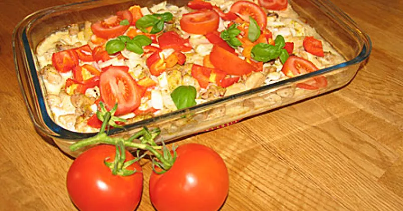 Stek baconet knaprigt. Strimla lök och skär övriga grönsaker i mindre bitar. Slanta morötterna i små bitar annars blir de så hårda. Lägg grönsakerna över kycklingen. Häll över champinjonerna. Smula över buljongtärningen. Blanda vatten och mjöl och häll det över kycklingen tillsammans med grädden. Ställ in i ugnen i ca 20 minuter. Rör om lite efter halva tiden.