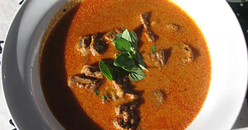Putsa köttet och dela det i mindre bitar. Finhacka löken. Bryn kött och lök i smör tillsammans med tomatpurén. Häll på vatten, soja, buljong och låt puttra minst en timme. Finhacka sardellfiléerna och lägg i tillsammans med grädden. Smaka av med salt och peppar. Låt puttra en stund till. Servera med ris eller potatis.