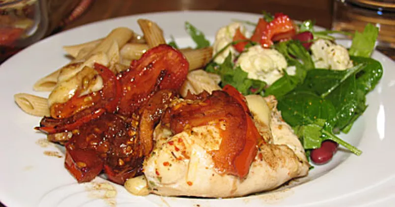 Sätt ugnen på 200 grader. Lägg tomater och vitlök i en ugnsfast form. Tillsätt olja, vinäger salt och peppar. Låt stå i ugnen ca 10 minuter. Dela kycklingfiléerna till två tunna filéer vardera. Salta och peppra filéerna, lägg en skiva mozzarella, basilika eller oregano och rulla ihop. Lägg rullarna på tomaterna med skarven neråt. Låt stå i ugnen ytterligare 15 minuter. Kontrollera att kycklingen är genomstekt. Servera med pasta.