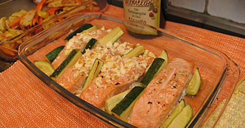 Lägg laxen i en ugnsfast form. Skär ett snitt i varje filé och tryck ned smulad fetaost i snittet. Pensla zucchinistavarna med olivolja och fördela runt laxen. Salta och peppra. Sätt in i ugn ungefär 12-15 minuter.