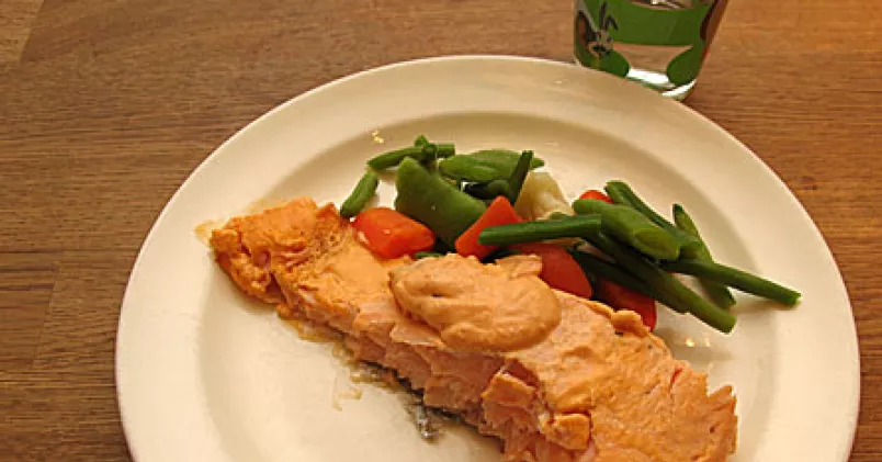 Sätt ugnen på 200 grader. Lägg laxen i en ugnsfast form och peppra bitarna. Koka ihop fond, vatten, crème fraiche, grädde och senap. Häll såsen över laxen och sätt in i ugn ungefär 20-30 minuter. Det beror på hur stora laxbitarna är.