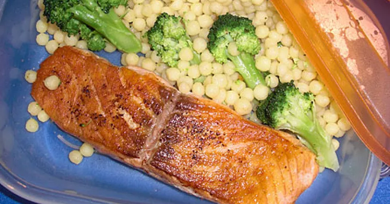Skölj och dela broccolin i mindre buketter. Låt koka med couscousen när 4 minuter återstår av koktiden. Häll av vattnet. Blanda i olivolja. Smaka av med svartpeppar. Stek laxen på medelstark värme 2 minuter på varje sida. Salta och peppra laxen.