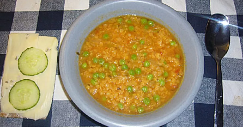Skölj de röda linserna i vatten. Hacka löken och fräs den i olja tillsammans med curry. Pressa i två vitlöksklyftor och rör om. Häll på en liter vatten och smula i buljongtärningarna. Lägg i de röda linserna och koka på låg värme i tio minuter tills de blivit mjuka. Häll i tomatpurén och rör om ordentligt. Lägg i de frysta ärtorna och låt soppan puttra i några minuter och smaka av.