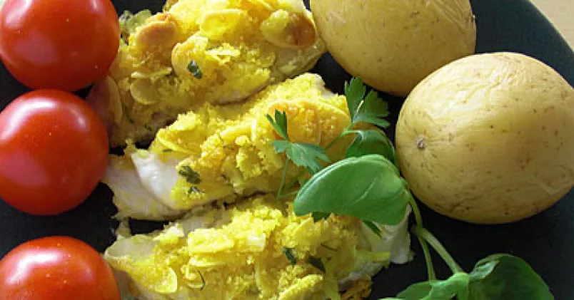 Blanda margarinet med ströbröd, mandel, gurkmeja, salt, pressad vitlök och persilja. Bred blandningen över fisken.