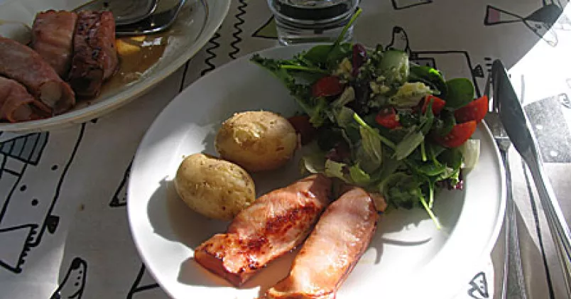 Halvtina fisken och dela den i 8 bitar. Det blir ungefär 2 cm skivor. Rulla in varje bit i skinka. Stek två minuter på en sida, vänd och stek ytterligare 2 minuter. Servera med potatis eller potatismos och en god sallad.