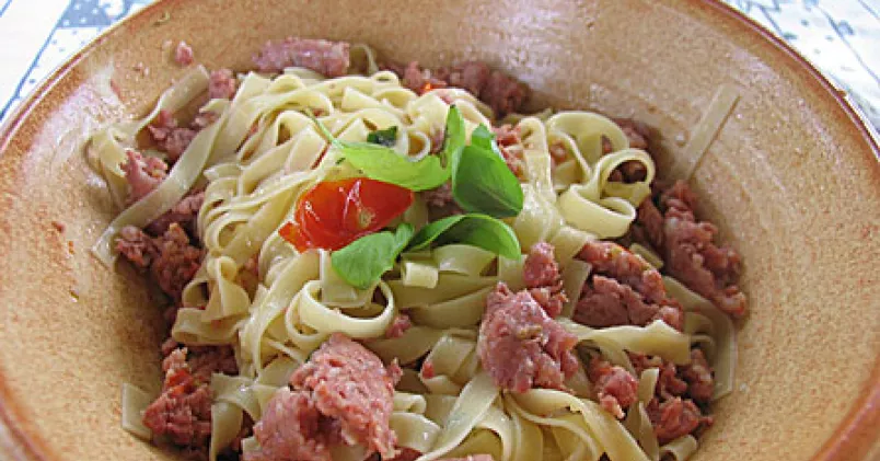 Ta bort skinnet från korven och mosa den med gaffel. Bryn färsen på hög värme i oljan några minuter. Tillsätt vitlök, tomater och vin. Låt det koka ihop några minuter. Blanda denna korvröra med kokt spagetti. Salta och peppra och riv över massor med parmesanost.