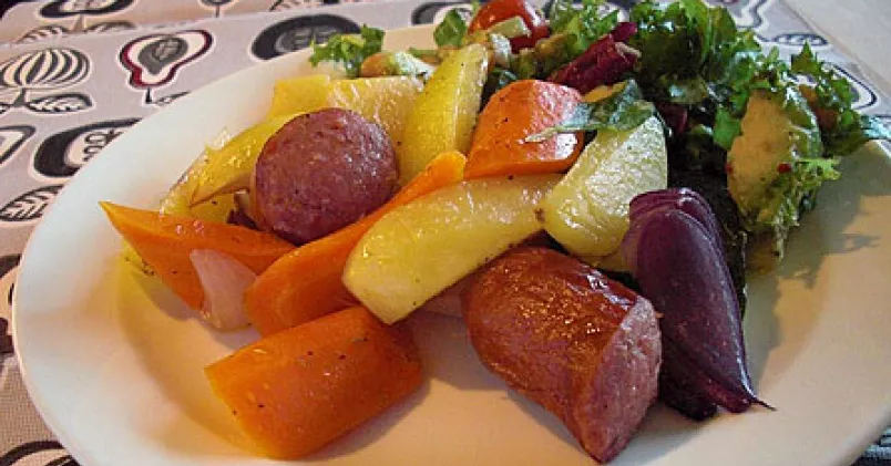 Skala och skär kålrot, potatis, morot och lök i bitar. Dela squashen i bitar. Dela korven. Jag använder korv med lite "bett" men det är ju en smaksak och det går lika bra med falukorv.
