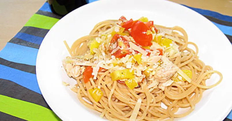 Koka spagettin enligt anvisningarna. Hacka paprika, lök och vitlök fint. Hetta upp olivolja i en kastrull och bryn paprika, lök och vitlök några minuter. Häll av vätskan från tonfisken och tillsätt tonfisken i kastrullen. Pressa lite citronsaft över. Rör om och strö över de hackade tomaterna. Salta och peppra. Blanda ned riven ost. Blanda i spagettin.