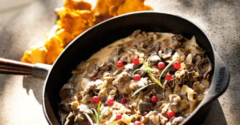Det finns så mycket gott man kan göra med svamp. Här är ett recept från Svampkokboken på renskavsgryta med både svamp och enbär.