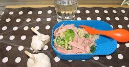 Jag brukar alltid få ris över. Och det här är faktiskt ett riktigt gott sätt att servera ris fast i ny tappning. Välj det kött du har hemma; korv, skinka eller kassler. Till barnens förtjusning har jag vid något tillfälle använt halverade köttbullar. Tag det du har i kylskåpet.