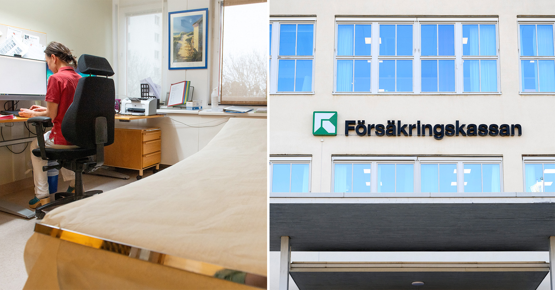 En delad bild. Till vänster sitter en kvinnlig läkare med ryggen mot bilden. Hon jobbar framför datorn i ett mottagningsrum på en vårdcentral. Till höger syns Försäkringskassans gröna logga  mot en beige fasad.