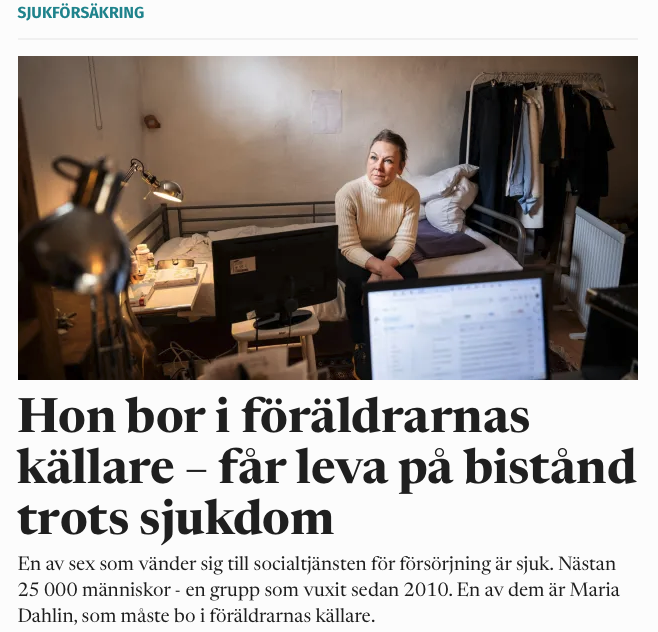 I måndags berättade Kollega om Maria Dahlin. Hon har trötthet, hjärntrötthet och kraftig huvudvärk efter ett ryggmärgsprov som gick fel. Försäkringskassan anser att hon har nedsatt arbetsförmåga – men nekar henne ändå sjukersättning. Nu tvingas hon, likt 25 000 andra sjuka, leva på ekonomiskt bistånd.