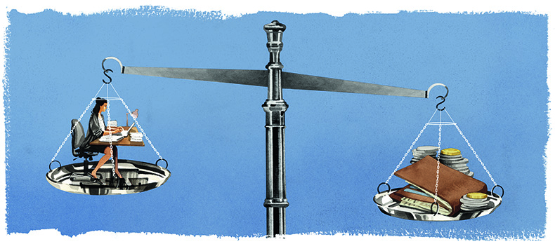 Vad väger tyngst för dig – höjd lön eller att känna arbetsglädje och meningsfullhet? Illustration: Fredrik Tjernström