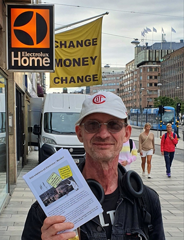 Tony Karlsson delar ut flygblad utanför Electrolux butik i centrala Stockholm. Foto: Jan Strannerud