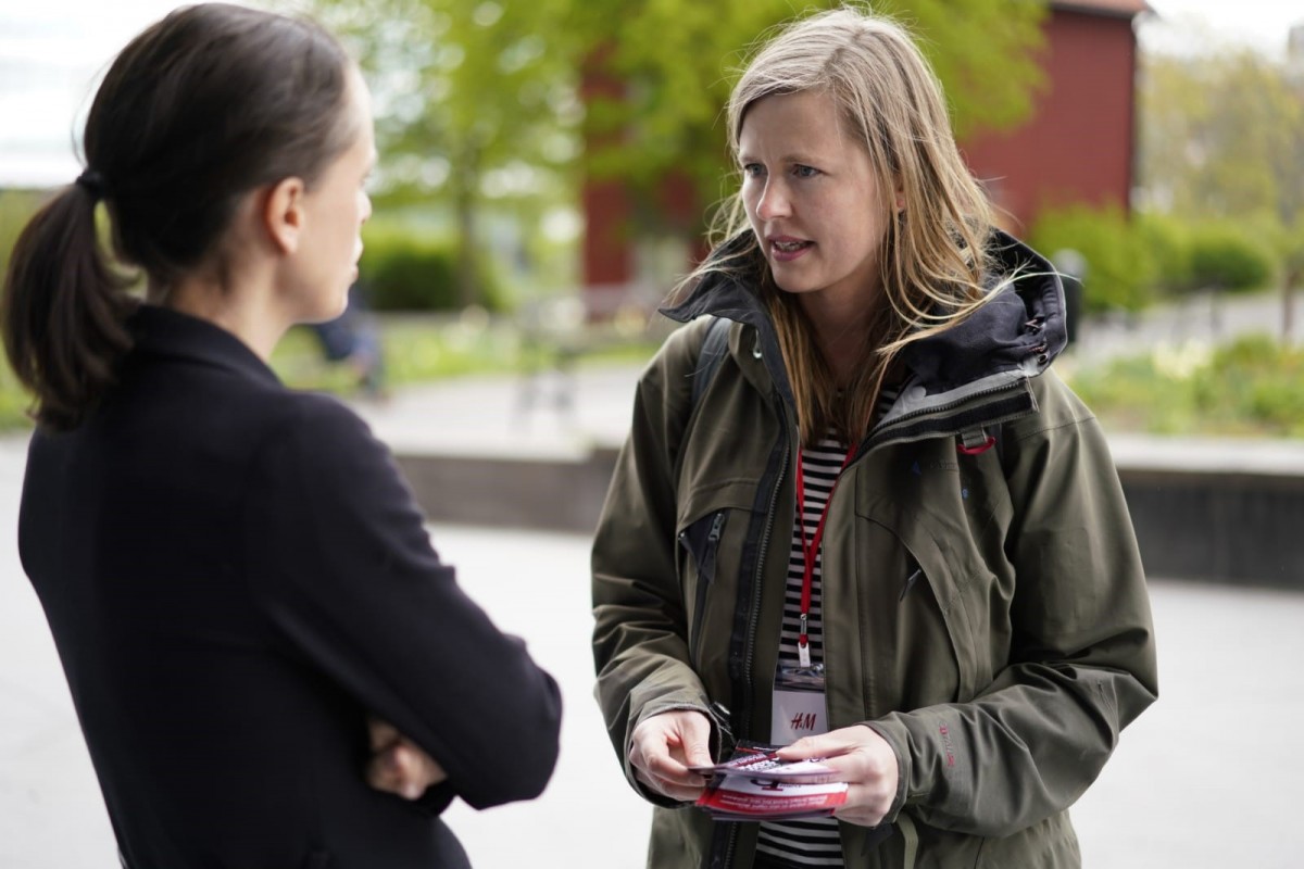 Maria Sjödin, kommunikationsansvarig på Fair Action pratar med aktieägare utanför H&M:s stämma i tisdags. Foto: Gabriele Francois Casini